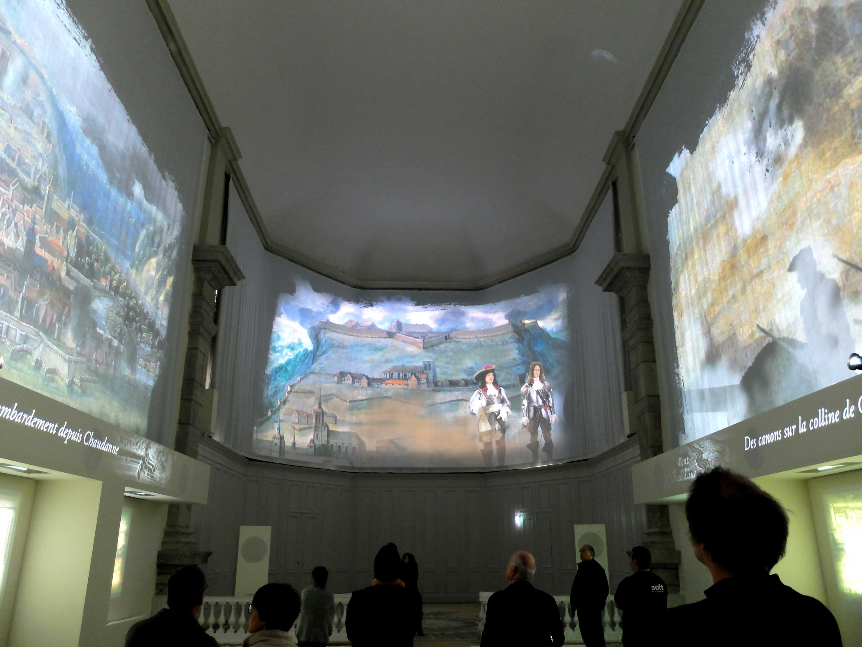 La chapelle Saint-Etienne, située au cœur même de la forteresse de Besançon, a été entièrement réaménagée pour accueillir un dispositif immersif où le son et l’image vous enveloppent véritablement. Les murs, le chœur et la voûte deviennent d’immenses surfaces de projections qui s’opposent ou se conjuguent au cours du spectacle, devenant des scènes grandeur nature où se dévoilent et s’opposent assaillants et défenseurs, points de vues de l’intérieur comme de l’extérieur, puissants et populations, maréchaux et soldats.